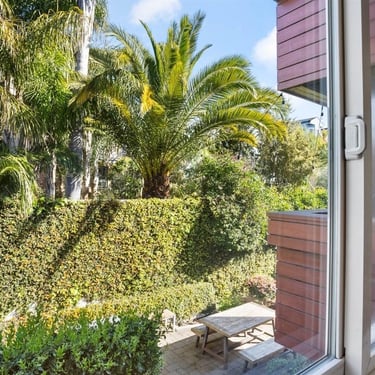 Bright and inviting, the south-facing living space is bathed in natural light, while the peaceful north-facing bedroom overlooks a lush shared yard with seating, greenery, and a BBQ—ideal for relaxing or entertaining.