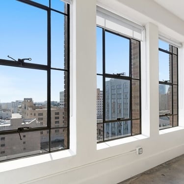 Expansive industrial windows flooding the space with natural light + stunning views